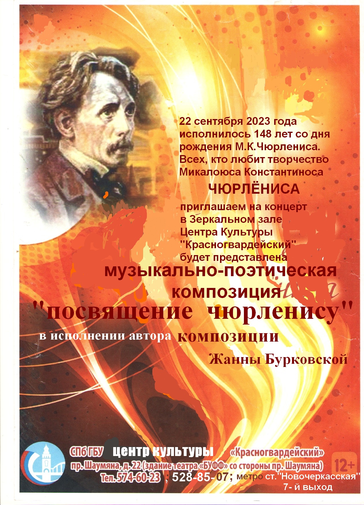 ПРЕДСТАВЛЕНИЕ 26.09.2023г.в ЦК "КРАСНОГВАРДЕЙСКИЙ" МУЗЫКАЛНО -ЛИТЕРАТУРНОЙ КОМПОЗИЦИИ . "ПОСВЕЩЕНИЕ ЧЮРЛЕНИСУ"